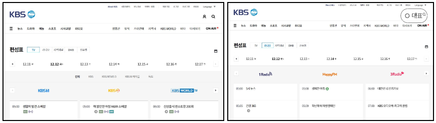 KBS 홈페이지에 들어가서 → 오른쪽 상단의 KBS - ON AIR 버튼을 누르면 → KBS1 / KBS2의 실시간 프로그램을 시청할 수 있습니다.
